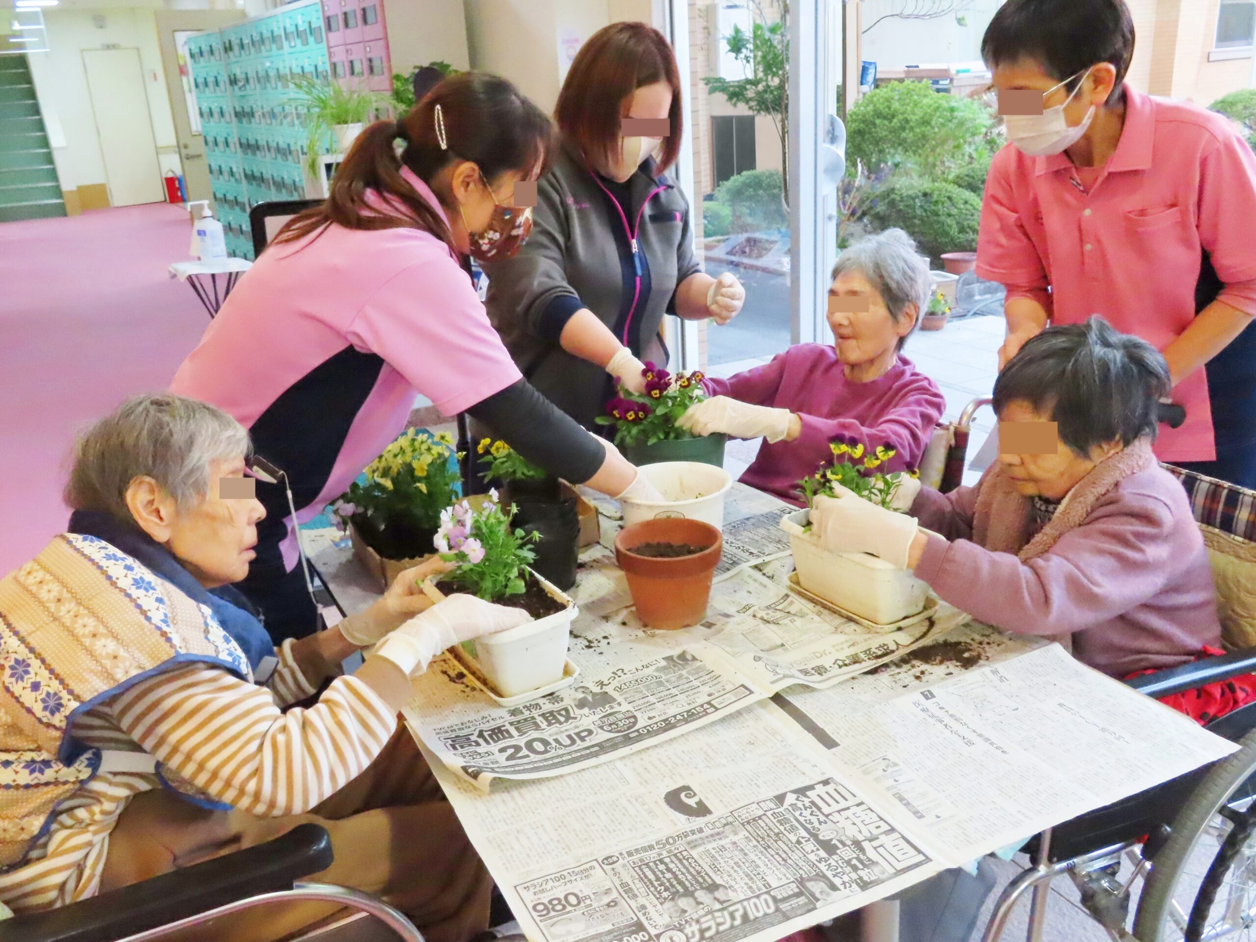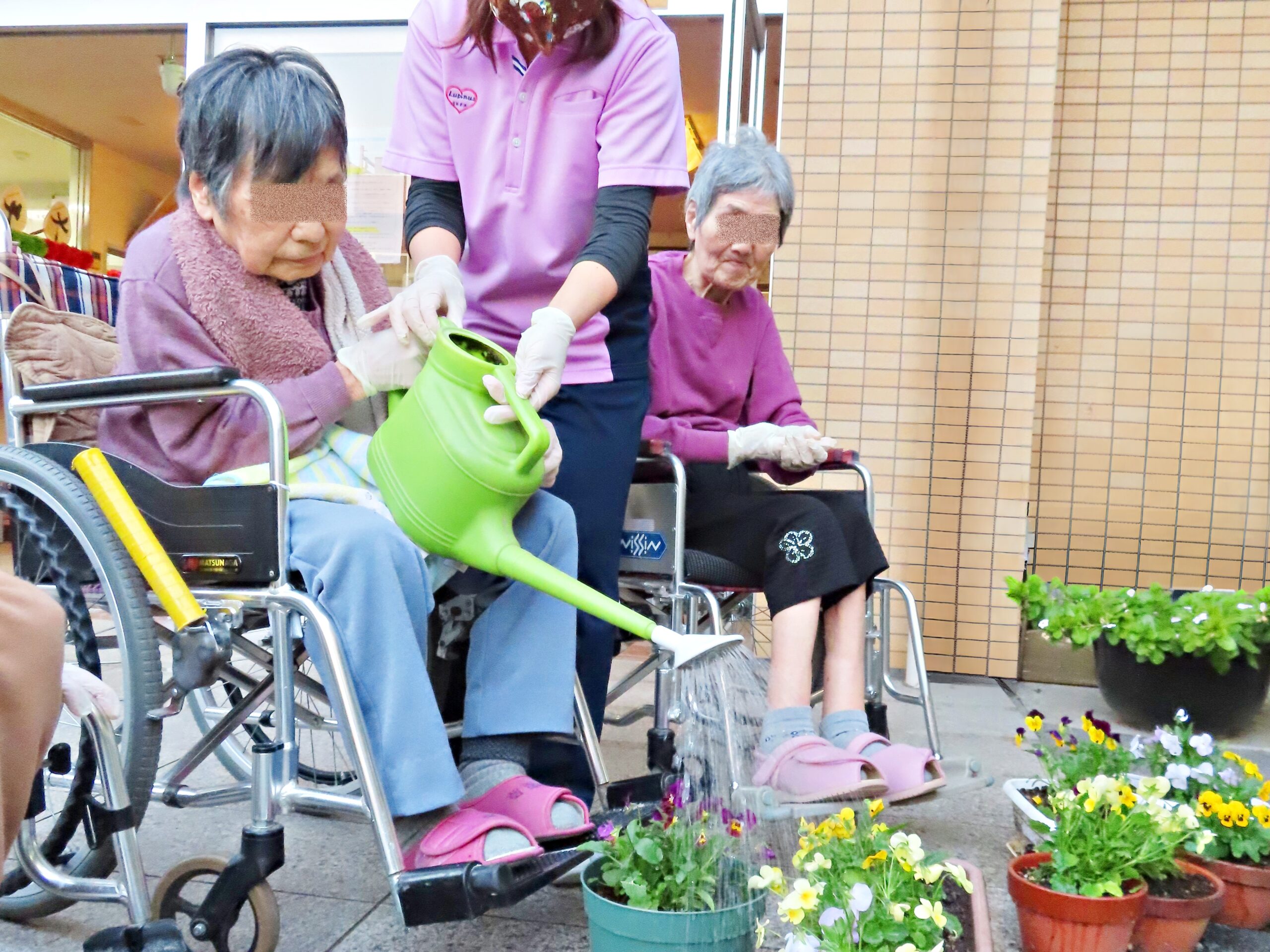 利用者様とスタッフみんなでお好きなお花を植えて、園の玄関を華やかにしていただきます♪